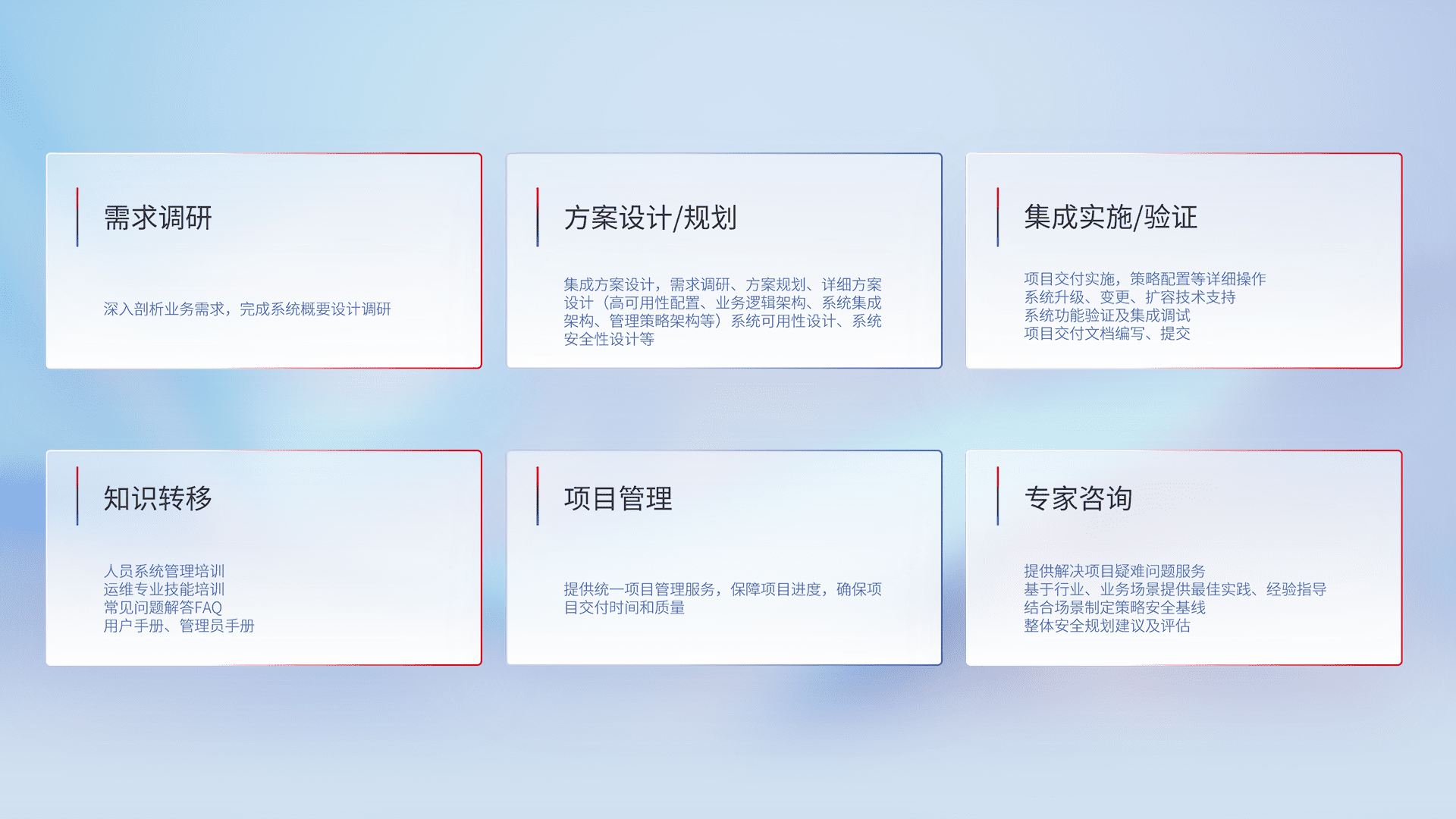 针对客户行业特性,,将宏观的安全战略和需求,,,,通过专业的交付服务,,,,实现项目落地,,,,为客户提供标准规范的集成交付服务。。